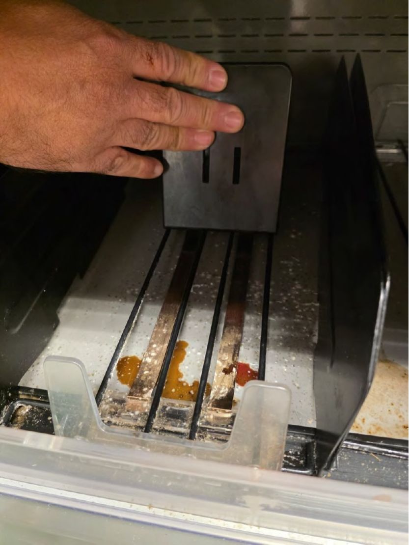 En bild visar en färdigrätt som finns i ett mögelangripet kylskåp i ett personalutrymme där även möbler och golv är i undermåligt skick.
